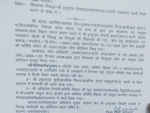 यहां बताना चाहते हैं कि जिला शिक्षा अधिकारी द्वारा इंदुनाथ तिवारी प्राचार्य शासकीय बा.उ.मा.वि गढ़ाकोटा विकासखंड रहली जिला सागर की 9 विन्दुओं की जांच कर 3 विन्दुओं पर जांच कर इंदुनाथ तिवारी प्राचार्य शासकीय बा.उ.मा.वि गढ़ाकोटा विकासखंड रहली जिला सागर को दोषी पाते हुए जिला शिक्षा अधिकारी जिला सागर द्वारा आपने कार्ययालीन पत्र क्रमांक/ सतर्कता/जांच/2024/7443 सागर दिनांक 24/09/2024 के द्वारा आयुक्त लोक शिक्षण संचलनालय मप्र भोपाल को लेख कर जांच में दोषी पाते हुए इंदुनाथ तिवारी प्राचार्य शासकीय बा.उ.मा.वि गढ़ाकोटा विकासखंड रहली जिला सागर पर कार्यवाही हेतु लेख किया गया लेकिन आज दिनांक तक आयुक्त के फाइल में हस्ताक्षर होने के बाद भी इंदुनाथ तिवारी प्राचार्य शासकीय बा.उ.मा.वि गढ़ाकोटा विकासखंड रहली जिला सागर पर कोई कार्यवाही का आदेश जारी नहीं हो रहा हैं।