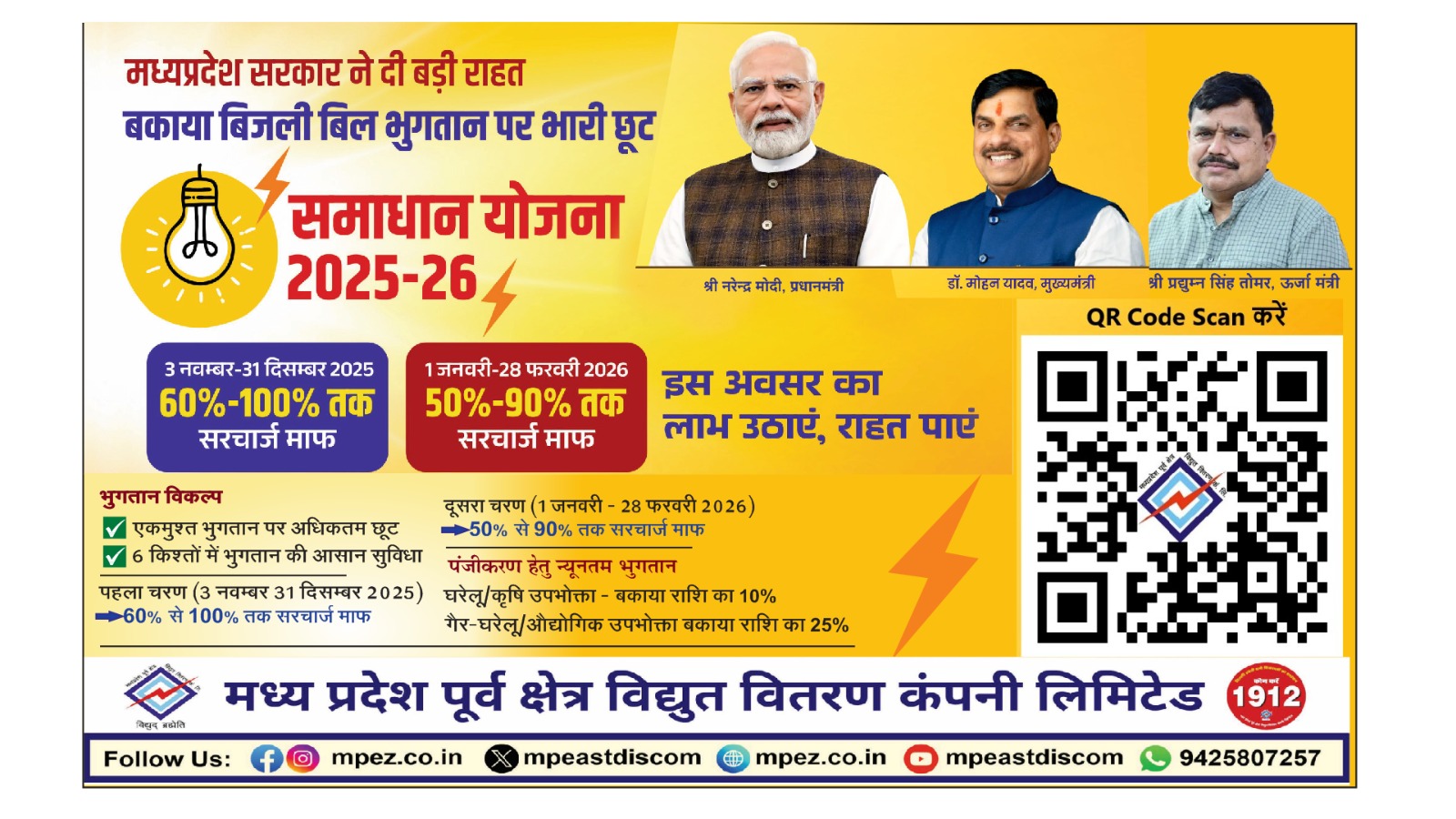 एकमुश्त भुगतान पर विशेष छूट तथा 6 किस्तों में भुगतान की सुविधा भी उपलब्ध रहेगी। कनिष्ठ यंत्री विजय धुर्वे ने बताया कि यह योजना मुख्यमंत्री डॉ. मोहन यादव और ऊर्जा मंत्री श्री प्रद्युम्न सिंह तोमर के मार्गदर्शन में चलाई जा रही है। जिससे लाखों उपभोक्ताओं को आर्थिक राहत मिलेगी।अधिकारियों ने उपभोक्ताओं से अपील की है कि वे इस सुनहरे अवसर का लाभ उठाएं, QR कोड स्कैन कर अधिक जानकारी प्राप्त करें और अपने बिजली बिलों का शीघ्र निपटान करें।