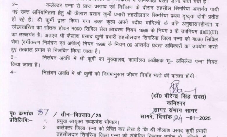 सागर। संभागायुक्त डॉ. वीरेन्द्र सिंह रावत ने पन्ना कलेक्टर सुरेश कुमार के प्रतिवेदन पर प्रभारी तहसीलदार सिमरिया कैलाश कुर्मी को तत्काल प्रभाव से निलंबित कर दिया है। तहसीलदार श्री कुर्मी के विरुद्ध राजस्व महा अभियान 3.0 एवं राजस्व प्रकरणों सहित अन्य विभागीय कार्यों के निराकरण में लापरवाही बरतने पर निलंबन की कार्यवाही की गई है। निलंबन अवधि में इनका मुख्यालय अधीक्षक भू अभिलेख कार्यालय पन्ना निर्धारित किया गया है।