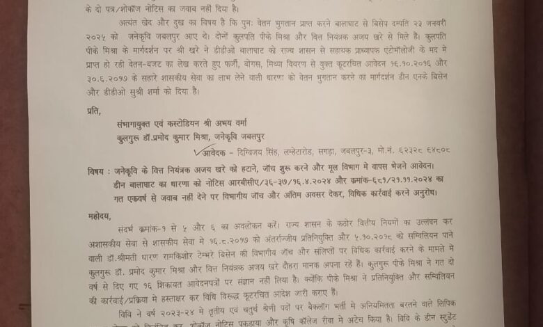 जवाहरलाल नेहरू कृषि विश्वविद्यालय के वित्त नियंत्रक अजय खरे और कृषि कॉलेज बालाघाट के डीन ने इस बात पर कोई आपत्ति नहीं उठाई की जब अंतिम उपस्थिति की तारीख गोंदिया में 31 जुलाई है तो एलपीसी 24 अगस्त 2017 को क्यों जारी हुआ है। गोंदिया से 24 8 2017 को जारी एलपीसी के आधार पर कृषि कॉलेज बालाघाट पिछले 8 साल से धरना का वेतन बना रहा है।
