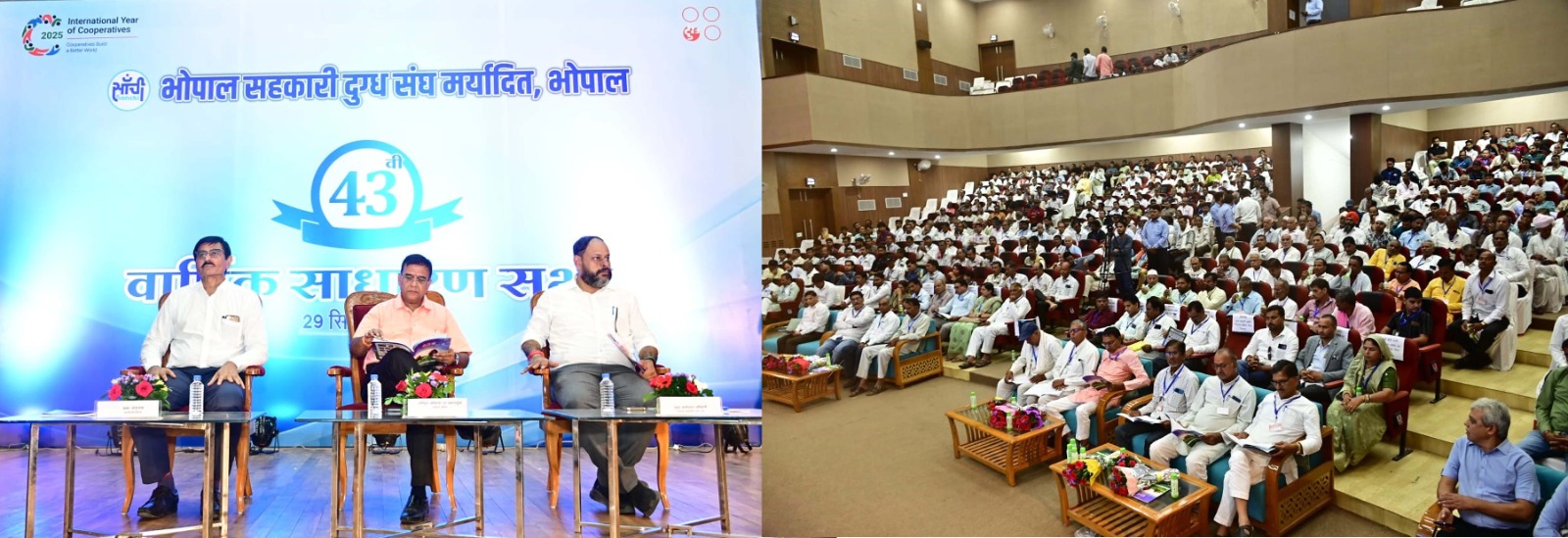 भोपाल। एमपी स्टेट कोआपरेटिव डेयरी फेडरेशन लिमिटेड (एमपीसीडीएफ) भोपाल से संबद्ध भोपाल सहकारी दुग्ध संघ मर्यादित, भोपाल की 43वीं वार्षिक साधारण सभा वर्ष 2024-25, दिनांक 29 सितम्बर 2025 को ‘‘आडीटोरियम’’ पंडित खुशीलाल शर्मा शासकीय (स्वशासी) आयुर्वेद महाविद्यालय एवं संस्थान, साईन्स हिल्स, भोपाल में आयोजित की गई। वार्षिक साधारण सभा की अध्यक्षता प्रशासक, भोपाल सहकारी दुग्ध संघ मर्यादित, भोपाल के प्रतिनिधि श्री प्रकाश नायक अतिरिक्त अनुविभागिय अधिकारी द्वारा की गई। संघ के मुख्य कार्यपालन अधिकारी, श्री प्रीतेश जोशी द्वारा वार्षिक साधारण सभा में रखे गए प्रस्तावों का पर अनुमोदन प्राप्त किया गया।