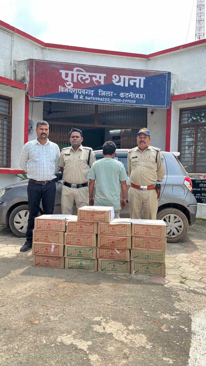 कटनी@शेरा मिश्रा। विजयराघवगढ़ नवरात्र पर्व के दौरान जब पूरा क्षेत्र श्रद्धा और भक्ति में डूबा हुआ था उसी दौरान विजयराघवगढ़ पुलिस ने अपराधियों पर नकेल कसते हुए एक बड़ी कार्यवाही को अंजाम दिया। थाना प्रभारी रीतेश शर्मा के नेतृत्व में पुलिस टीम ने सिंघवारा गेट रोड पर दबिश देकर 850 पाव (153 लीटर) अवैध देशी प्लेन शराब से भरी 17 पेटी और करीब तीन लाख रुपये की मारुति सुजूकी कार जब्त की। आरोपी को मौके पर गिरफ्तार कर न्यायालय में पेश किया गया, जहाँ से उसे जेल भेजा गया।