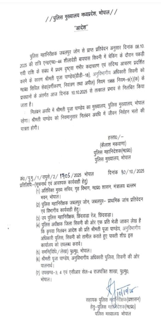 भोपाल। प्रदेश के सिवनी में पुलिसकर्मियों पर करोड़ों रुपये की हवाला राशि जब्त कर आपस में बांटने का गंभीर आरोप लगा है। इस मामले में बड़ी कार्रवाई हुई है। सिवनी एसडीपीओ पूजा पांडे को निलंबति कर दिया गया है। SDOP पूजा पांडे को डीजीपी कैलाश मकवाना ने सस्पेंड कर दिया है ।
