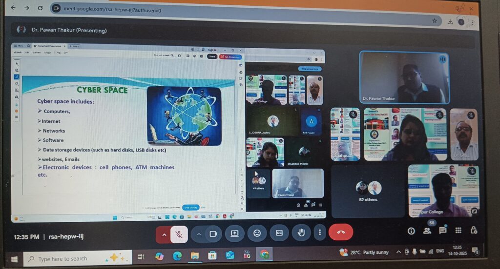 मुख्य अतिथि डॉ० नीरज दुबे ने कहा कि डिजिटल इंडिया में ई- ऑफिस के माध्यम से कार्य आसान हुआ है, छात्रों एवं शिक्षकों को नवाचार के कारण अंतरराष्ट्रीय परिदृश्य पर ला दिया है। विशिष्ट अतिथि डॉ० सरोज गुप्ता ने अपने उद्बोधन में कहा कि डिजिटल इंडिया एवं नवीन शिक्षण पद्धति से छात्र-छात्राओं एवं शिक्षकों को ई- क्लास, यूट्यूब के लाभ के बारे में जानकारियां आसानी से मिल रही हैं।मुख्य वक्ता हिमाचल प्रदेश के डॉ० पवन कुमार ने अपना व्याख्यान देते हुए कहा कि साइबर स्पेस एवं साइबर लॉ के बारे में जानना परम आवश्यक है जिसमें ऑनलाइन फ्रॉड, यूपीआई फ्रॉड, फेक मेल एवं आईटी लाॅ के संदर्भ में उन्होंने बताया।