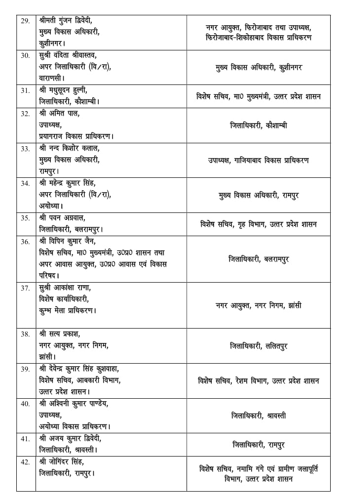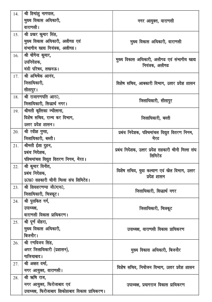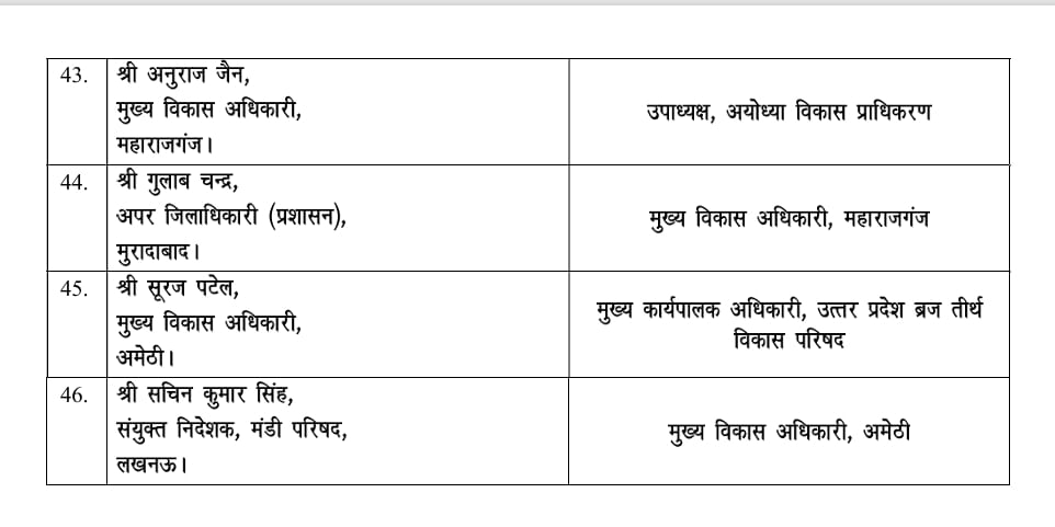 लखनऊ। आज प्रदेश सरकार ने प्रदेश की कानून व्यवस्था कों देखते हुए 46 आईएएस अफसरों का तबादला किया है। इसमें आईएएस कृतिका ज्योत्सना को बस्ती का डीएम, वाराणसी के सीडीओ हिमांशु नागपाल को वाराणसी का नगर आयुक्त बनाया गया है। वाराणसी की एडीएम वंदिता श्रीवास्तव को कुशीनगर का सीडीओ बनाया गया है। रामपुर के सीडीओ नंद किशोर कलाल को गाजियाबाद का उपाध्यक्ष बनाया गया है। मिर्जापुर के आईएएस बाल कृष्ण त्रिपाठी को सचिवालय सामान्य प्रशासन बनाया गया है। उनकी जगह राजेश कुमार की नियुक्ति की गई है।