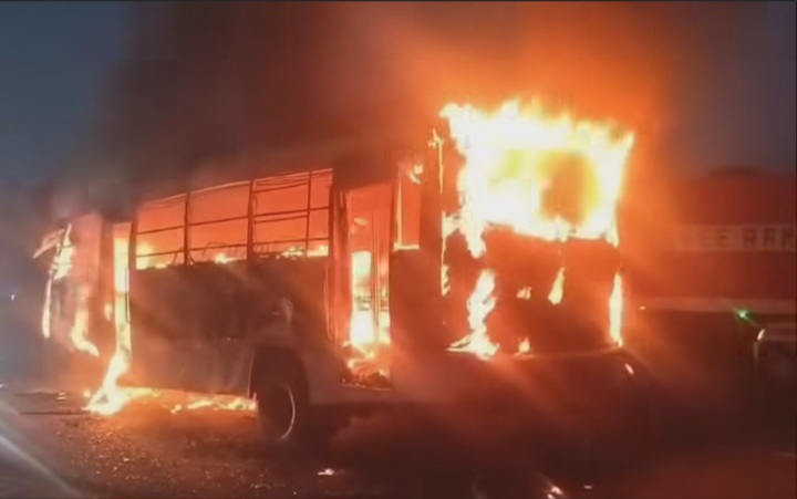भिड़ंत के बाद बस में लगी भीषण आग, 25 सवारियो ने बस से बाहर निकलकर बचाई जान