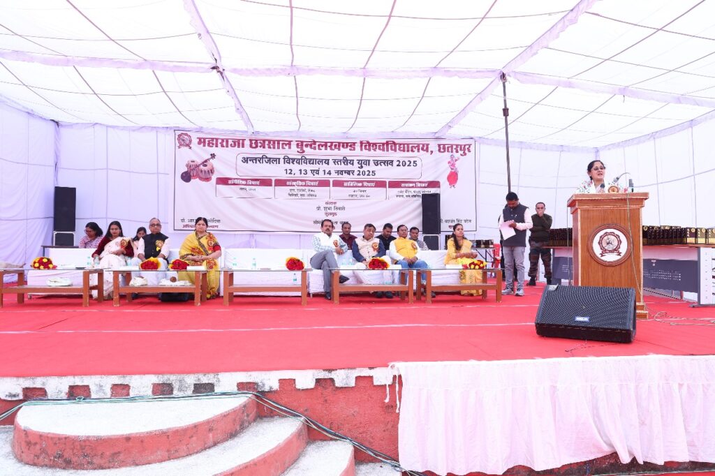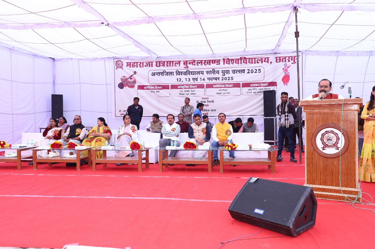 छतरपुर। महाराजा छत्रसाल बुंदेलखंड विश्वविद्यालय, छतरपुर में आयोजित तीन दिवसीय अंतरजिला विश्वविद्यालय स्तरीय युवा उत्सव 2025 का भव्य समापन 14 नवंबर को हुआ। यह समारोह विश्वविद्यालय की ऊर्जावान कुलगुरु प्रो शुभा तिवारी के मार्गदर्शन में आयोजित हुआ, इस अवसर पर मुख्य अतिथि माननीय श्री अरविन्द पटैरिया, विधायक राजनगर विधानसभा, विशिष्ट अतिथि कार्यपरिषद सदस्य श्री नीरज भार्गव, वरिष्ठ आचार्य एवं कार्यपरिषद सदस्य प्रो ममता वाजपेई, विश्वविद्यालय के अधिष्ठाता छात्र कल्याण डॉ आर एस सिसौदिया, विश्वविद्यालय के डीसीडीसी प्रो ओ पी अरजरिया, युवा उत्सव प्रभारी श्रीमती निकिता यादव तथा कुलसचिव श्री यशवंत सिंह पटेल मंचासीन रहे।