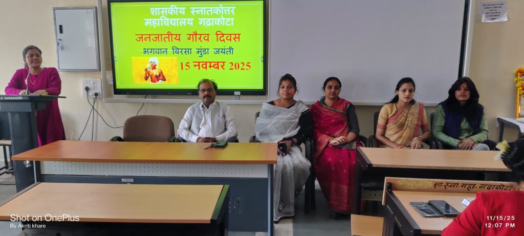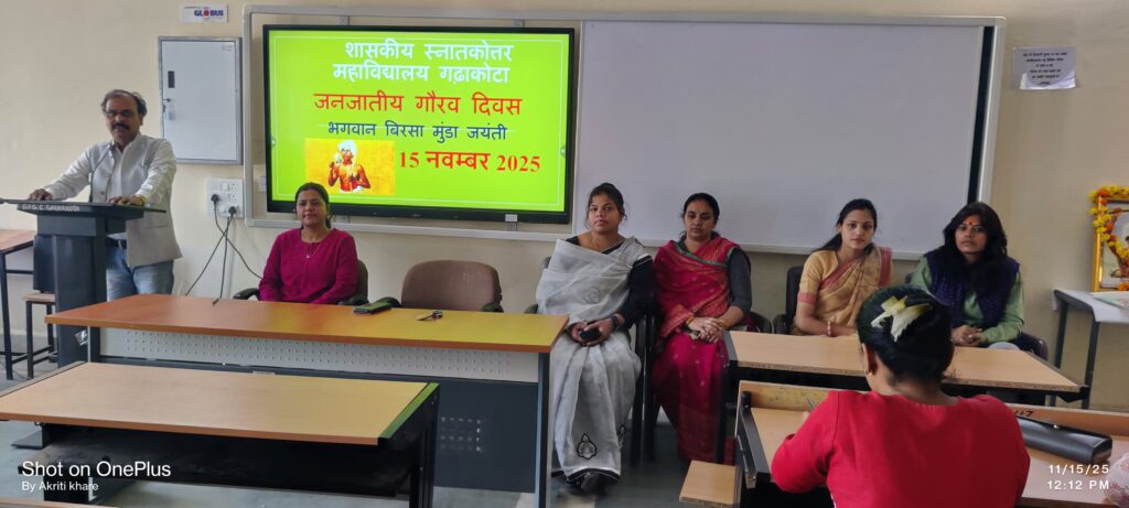 गढ़ाकोटा। @पीएल पटेल। शासकीय स्नातकोत्तर महाविद्यालय गढ़ाकोटा में भगवान बिरसा मुंडा जी की 150वीं जयंती के अवसर पर जनजातीय गौरव दिवस मनाया गया। कार्यक्रम की अध्यक्षता महाविद्यालय के प्राचार्य डॉ. घनश्याम भारती ने की। कार्यक्रम का संचालन सुश्री आकृति खरे ने तथा आभार पुष्पेंद्र बर्मन ने व्यक्त किया।