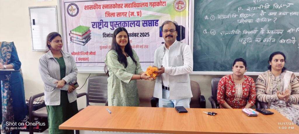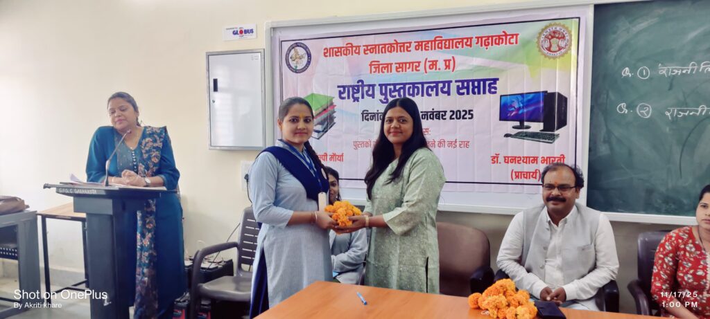गढ़ाकोटा@पीएल पटेल। शासकीय स्नातकोत्तर महाविद्यालय गढ़ाकोटा में आज राष्ट्रीय पुस्तकालय सप्ताह का उत्साहपूर्वक शुभारंभ किया गया। कार्यक्रम का आरंभ संस्था प्रमुख डॉ. घनश्याम भारती द्वारा मां सरस्वती के समक्ष दीप प्रज्वलित कर एवं पुस्तकालय विज्ञान के जनक डाॅ०एस०आर० रंगनाथन के छायाचित्र पर माल्यार्पण के साथ हुआ।