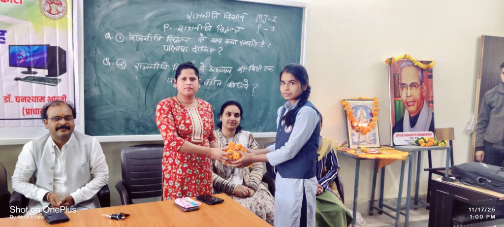 कार्यक्रम में भूगोल विषय की सहायक प्राध्यापक सुश्री आकृति खरे ने विद्यार्थियों को रीडिंग हैबिट विकसित करने के महत्व पर अत्यंत सारगर्भित और प्रेरक विचार प्रस्तुत किए। उन्होंने पुस्तक-पठन को विद्यार्थी जीवन की बौद्धिक प्रगति का सबसे सरल, प्रभावी और अनुशासित साधन बताया। उन्होंने कहा कि नियमित पठन न केवल ज्ञान बढ़ाता है, बल्कि मन को अनुशासन, एकाग्रता और आत्मविश्वास प्रदान करता है।