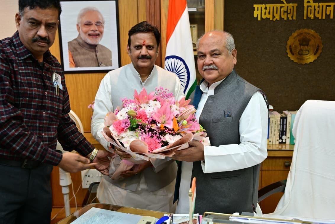 @भोपाल। उप मुख्यमंत्री श्री राजेंद्र शुक्ल ने विधानसभा के शीतकालीन सत्र के प्रथम दिन विधानसभा अध्यक्ष श्री नरेंद्र सिंह तोमर का उनके कक्ष में भेंट कर स्वागत किया।