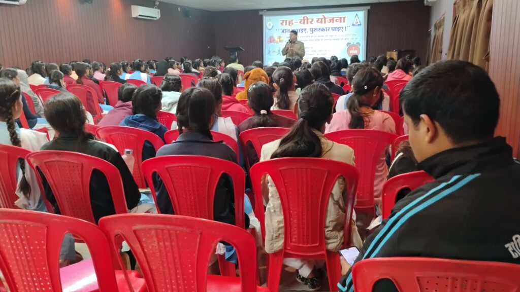 कार्यक्रम में “गोल्डन ऑवर” की महत्ता समझाते हुए “राहवीर योजना” की जानकारी दी गई, जिसके अंतर्गत सड़क दुर्घटना में घायल व्यक्ति को शीघ्र उपचार दिलाने पर सहयोगी को शासन द्वारा प्रोत्साहन राशि एवं व्यय प्रतिपूर्ति प्रदान की जाती है।