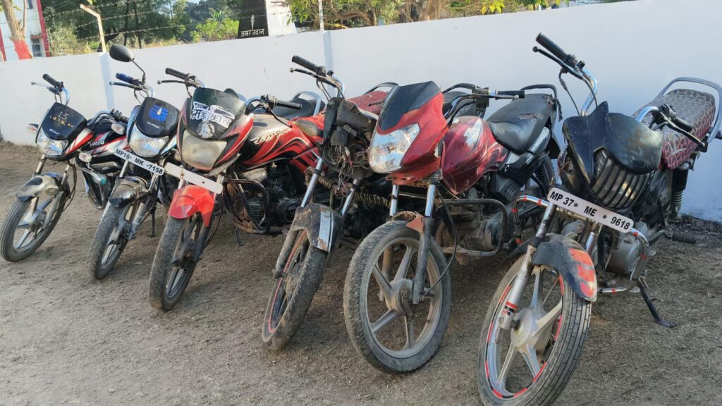 पुलिस टीम को जिला अस्पताल के पास से चोरी की गई मोटरसाइकिल संबंधी सूचना थाना सटई क्षेत्र अंतर्गत होने की प्राप्त हुई। पुलिस टीम द्वारा छापामार कार्यवाही की गई जिला अस्पताल के पास से चोरी की गई मोटरसाइकिल एचएफ डीलक्स सहित पृथक पृथक स्थान से चोरी की गई 6 मोटरसाइकिल- एचएफ डीलक्स, पैशन प्रो, टीवीएस स्पोर्ट, सीडी डीलक्स बरामद की गई। 1 मोटरसाइकिल छतरपुर जिला अस्पताल के पास से तथा अन्य 5 मोटरसाइकिल खजुराहो से 2, जटाशंकर मेला से 2 तथा 1 सागर जिले से चोरी की गई थी।