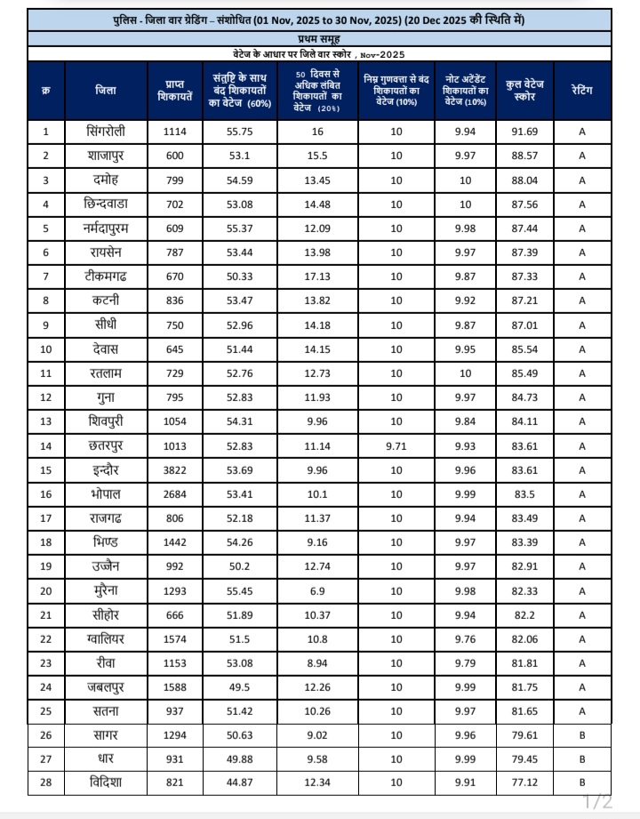 @सिंगरौली। पुलिस महानिरीक्षक रीवा जोन गौरव राजपूत, पुलिस उप महानिरीक्षक रीवा क्षेत्र हेमंत चौहान के निर्देशन में एवं पुलिस अधीक्षक मनिष खत्री के मार्गदर्शन में सी.एम.हेल्पलाइन 181 की शिकायतों के निराकरण में दि.20.12.25 को जारी जिलेवार ग्रेडिंग में सिंगरौली जिले ने कुल 91.69℅ वेटेज स्कोर के साथ ‘ए’ ग्रेडिंग प्राप्त करते हुए प्रथम समूह मे प्रदेश में प्रथम स्थान प्राप्त किया।