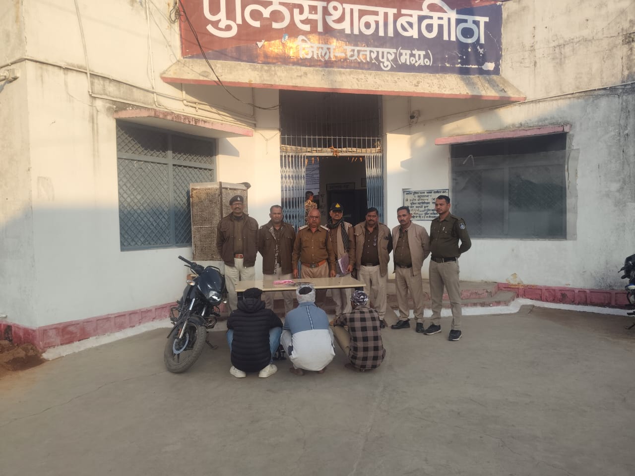 @छतरपुर- आशुतोष द्विवेदी। थाना बमीठा पुलिस ने ग्राम बरेठी अंतर्गत हवाई फायर कर धमकाने वाले तीन आरोपियों को किया गिरफ्तार, घटना में प्रयुक्त देशी कट्टा एवं मोटरसाइकिल बरामद। आरोपी दिनेश पिता बब्बू पाल हत्या के प्रयास, अवैध हथियार, मारपीट जैसे 3, दिनेश पिता मन्नू पाल गैर इरादतन हत्या, मारपीट जैसे 4, आरोपी देवेंद्र पाल हत्या का प्रयास, अवैध हथियार जैसे अपराध में पूर्व से लिप्त।