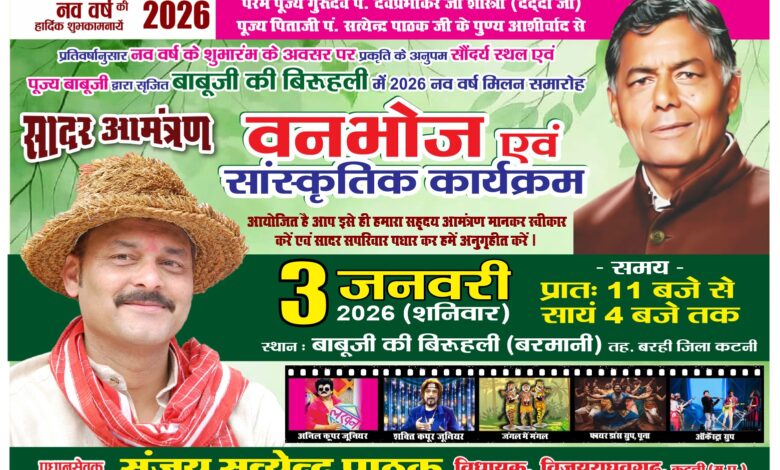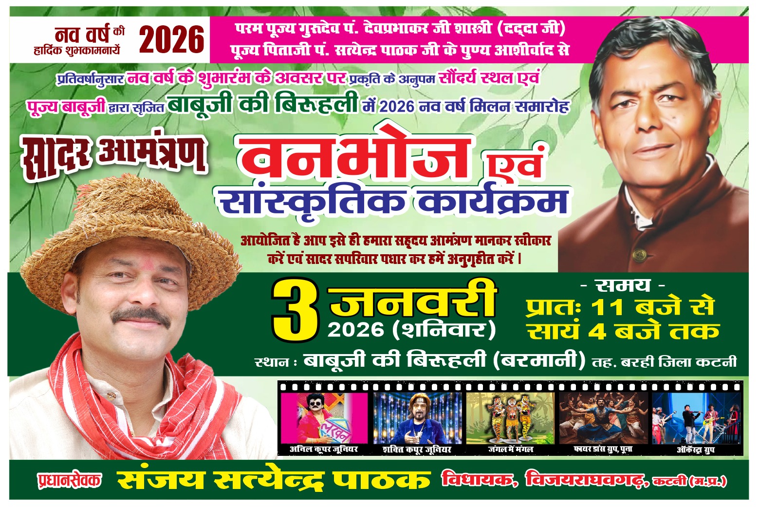 @कटनी-शेरा मिश्रा। विजयराघवगढ़ नववर्ष 2026 के शुभारंभ के अवसर पर प्रकृति की गोद में बसे अनुपम स्थल बाबूजी की बिरुहली (बरमानी) में प्रतिवर्षानुसार इस वर्ष भी वनभोज एवं भव्य सांस्कृतिक कार्यक्रम का आयोजन किया जा रहा है। यह आयोजन परम पूज्य गुरुदेव पं. देवप्रभाकर जी शास्त्री (दद्दाजी) एवं पूज्य पिताजी पं. सत्येन्द्र पाठक (बाबूजी) के पावन आशीर्वाद से संपन्न होगा। आयोजन 3 जनवरी 2026 शनिवार को प्रातः11 बजे से सायं 4 बजे तक तहसील बरही जिला कटनी स्थित बाबूजी की बिरुहली में आयोजित किया जाएगा। कार्यक्रम में क्षेत्रवासियों को सपरिवार आमंत्रित किया गया है।