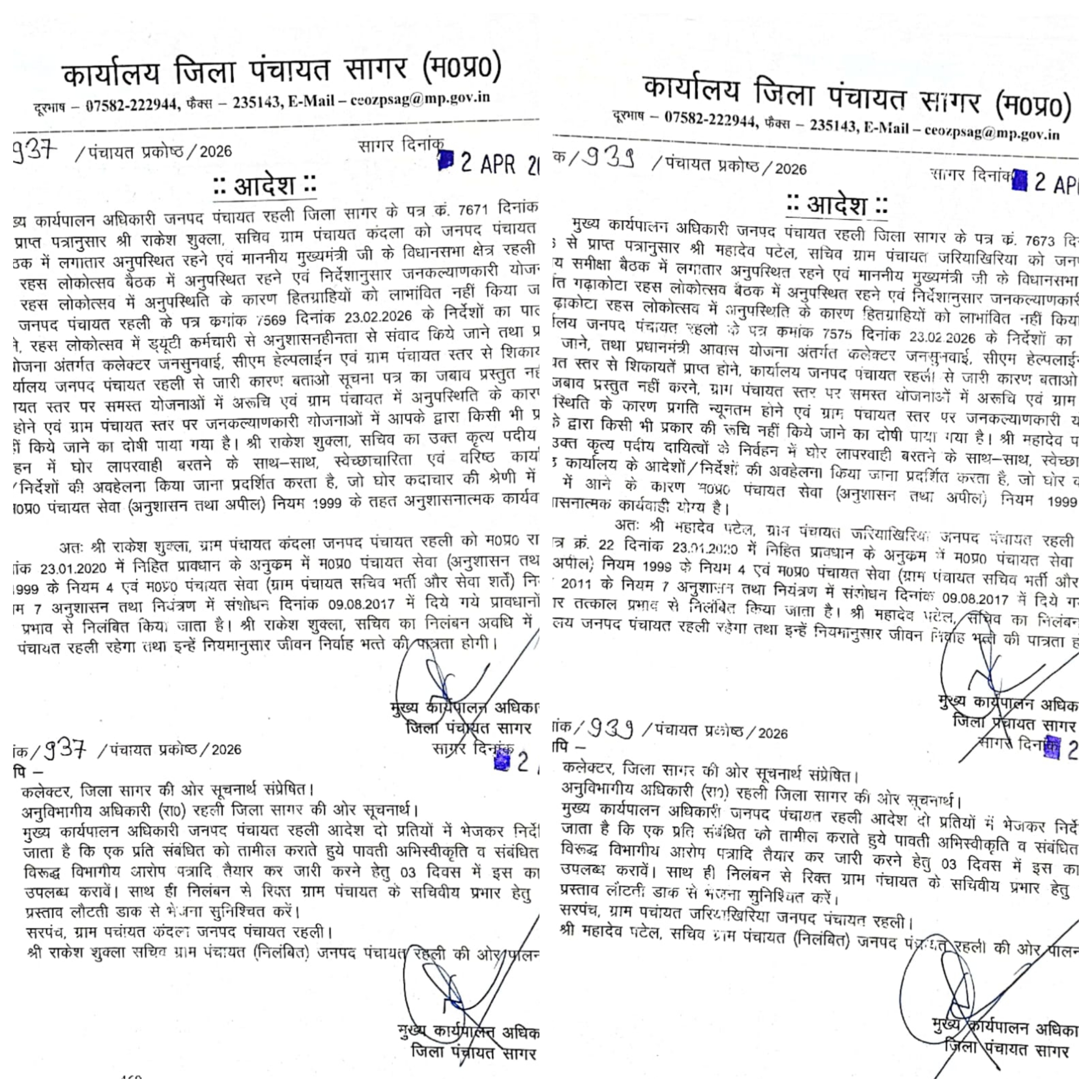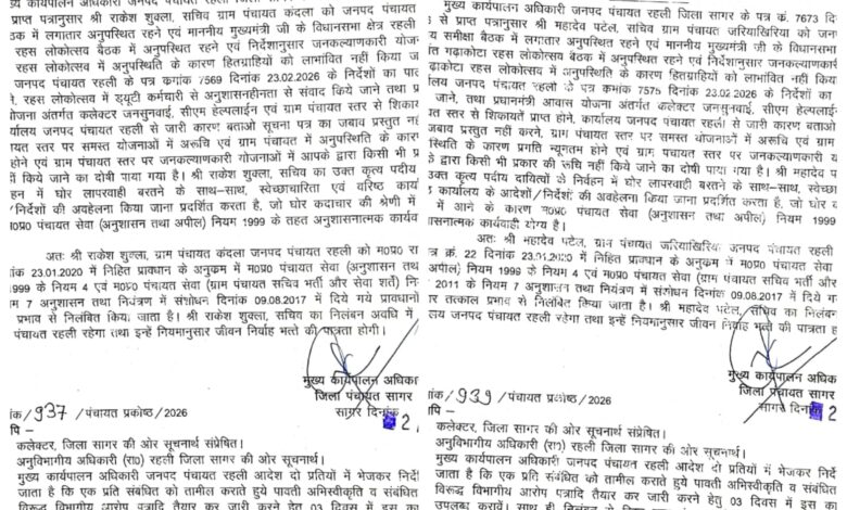 मुख्य कार्यपालन अधिकारी जनपद पंचायत रहली के पत्र क्रमांक 7671 दिनांक 06.03.2026 के अनुसार ग्राम पंचायत कंदला के सचिव राकेश शुक्ला को जनपद स्तरीय समीक्षा बैठकों में लगातार अनुपस्थित रहने, माननीय मुख्यमंत्री के विधानसभा क्षेत्र रहली में आयोजित गढ़ाकोटा रहस लोकोत्सव की महत्वपूर्ण बैठकों से गायब रहने और शासन की जनकल्याणकारी योजनाओं में गंभीर लापरवाही बरतने का दोषी पाया गया।