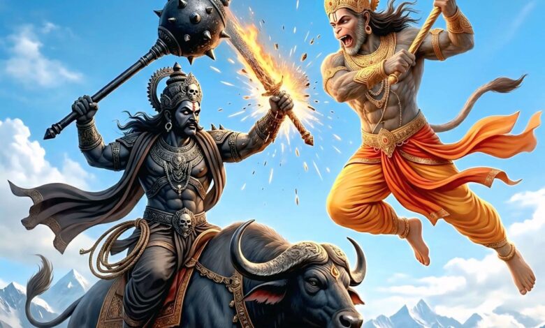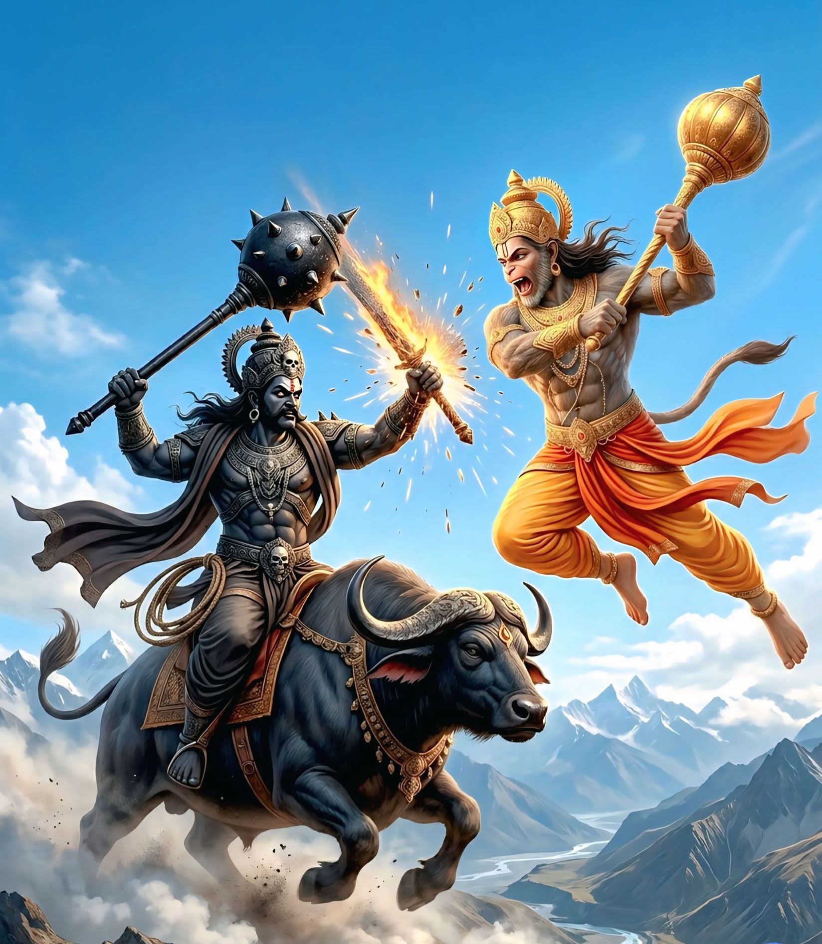 यमराज ने अपना भयानक यमदंड उठा लिया। आकाश में गर्जना गूंज उठी और उसी क्षण युद्ध आरंभ हो गया। यमराज ने प्रचंड गर्जना की और पूरे बल से हनुमान जी की ओर प्रहार किया। लेकिन हनुमान जी तनिक भी विचलित नहीं हुए। उन्होंने अपनी गदा घुमाई और यमराज के वार को रोक लिया। दोनों दिव्य अस्त्र आपस में टकराए तो ऐसी भयानक ध्वनि हुई कि दिशाएं गूंज उठी मानो पूरा ब्रह्मांड एक पल के लिए थम गया हो। यमराज ने दूसरा वार किया। इस बार अपनी विशाल गदा से वो वार प्रलय के समान था। पर हनुमान ने उसे भी रोक लिया। जब दोनों गदाएं टकराई तो यमराज की गदा टूट कर बिखर गई। क्षण भर के लिए यमराज भी चौंक गए। उन्हें ऐसी प्रतिरोध की उम्मीद नहीं थी। उन्होंने तुरंत अपनी तलवार निकाली और पूरी शक्ति से हनुमान की ओर फेंक दी। तलवार बिजली की तरह चमकती हुई हनुमान की ओर बढ़ी। लेकिन जो हुआ वो किसी ने सोचा भी नहीं था। हनुमान जी ने हवा में ही उस तलवार को पकड़ लिया। फिर उन्होंने अपनी मुट्ठी कस ली। अगले ही पल वो तलवार टुकड़ों में टूट कर नीचे गिर पड़ी। अब यमराज के मन में पहली बार चिंता की लहर उठी। क्रोध, अपमान और चुनौती तीनों भाव उनके भीतर उमड़ रहे थे। उन्होंने अपना सबसे शक्तिशाली अस्त्र उठाया। यमदंड यह वही दंड था जिसके सामने देवता भी कांपते थे। यमराज ने पूरी शक्ति से उसे हनुमान की ओर चलाया। यमदंड आग की लपटों की तरह आगे बढ़ रहा था। उसे अपनी ओर आता देख हनुमान जी के नेत्र अग्नि के समान चमक उठे। उन्होंने तुरंत अपना स्वरूप बढ़ाना शुरू कर दिया। क्षण भर में उनका शरीर पर्वत के समान विशाल हो गया।