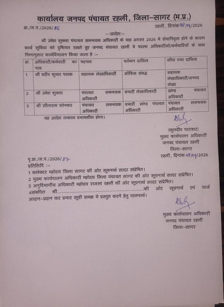 वहीं मामले में सबसे चौकाने वाला तथ्य तब सामने आया जब जनपद पंचायत रहली जिला सागर के प्रभारी मुख्यकार्यपालन कुलदीप पाराशर द्वारा अपने कार्यालय के आदेश क्रमांक/ज.पं/ 2026/86 रहली दिनांक 08/04/2026 के तहत निलंबित कर्मचारी प्रदीप कुमार पाठक कों सहायक लेखाधिकारी कार्यालय जनपद पंचायत रहली के पद पर पदस्थ कर दिया।