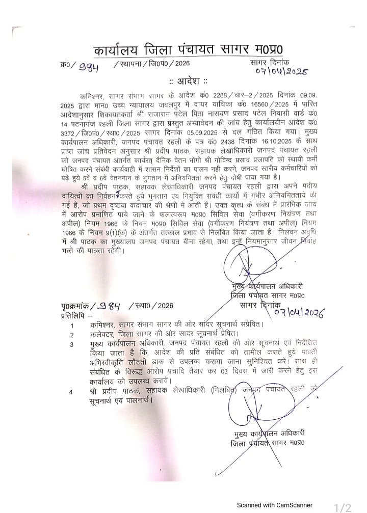 जानकारी के अनुसार कमिश्नर सागर संभाग सागर के कार्यालय के आदेश क्रमांक 2288/चार- 2/ 2025 दिनांक 09/09/2025 द्वारा माननीय उच्च न्यायालय में दायर याचिका क्रमांक 16560/2025 में पारित आदेशानुसार शिकायतकर्ता राजाराम पटेल तनय नारायण प्रसाद पटेल निवासी वार्ड क्रमांक 14 पटनागंज रहली जिला सागर द्वारा प्रस्तुत अभ्यावेदन की जांच हेतू जिला पंचायत के कार्यालय आदेश क्रमांक 3372/ जि.प/स्था/2025 सागर दिनांक 0509/2025 द्वारा जांच दल गठित किया गया जिसमें मुख्यकार्यपालन अधिकारी जनपद पंचायत रहली के पत्र क्रमांक 2438 दिनांक 16/10/2025 के तहत प्रस्तुत जांच प्रतिवेदन के आधार पर प्रथम दृष्टया कदाचार व अनीमिताओं का दोषी पाते हुए प्रदीप कुमार पाठक कों जिला पंचायत के मुख्यकार्यपान अधिकारी द्वारा अपने कार्यालय के पत्र क्रमांक/ 984/स्थापना/ जि.प/ 2026 सागर दिनांक 07/04/ 2026 के तहत प्रदीप कुमार पाठक कों निलंबन करते हुए निलंबन अवधि में पाठक का मुख्यालय बीना किया गया।