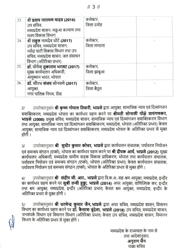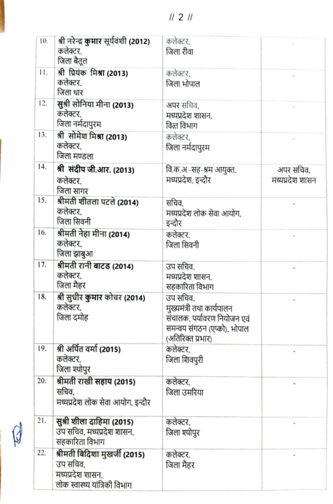 #भोपाल। प्रदेश सरकार ने आधीरात कों चलाई तबादला एक्सप्रेस दो दर्जन से अधिक आईएएस अधिकारियों के किये तबादले 13 जिलों के बदले कलेक्टर जिसमें सागर और दमोह कलेक्टर का भी हुआ तबादला प्रतिभा पाल बनी सागर कलेक्टर एवं प्रताप नारायण यादव बने दमोह कलेक्टर।