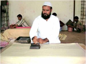 4. ब्लॉक प्रिंटिंग – लकड़ी के ब्लॉकों (भांतों) की मदद से हाथों से छपाई की जाती है। संतुलित दबाव और कोनों की सटीक छपाई से उत्कृष्ट डिज़ाइन उभरते हैं।