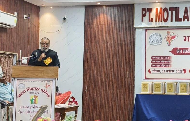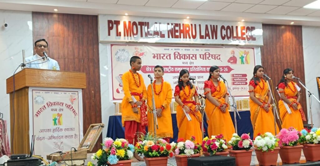 @छतरपुर। भारत विकास परिषद, मध्यक्षेत्र द्वारा 23 नवम्बर 2025 रविवार को पं. मोतीलाल नेहरू विधि महाविद्यालय, छतरपुर में क्षेत्र स्तरीय राष्ट्रीय समूहगान प्रतियोगिता- 25 भव्यता के साथ आयोजित हुई। इस प्रतियोगिता में विभिन्न प्रांतों की शाखाओं की चयनित टीमों ने उत्साहपूर्वक सहभागिता की,जिसमें कृष्णा पब्लिक स्कूल, सरोना,रायपुर की टीम ने हिंदी और संस्कृत भाषा में राष्ट्रीय भावना से ओतप्रोत दी गई गायन प्रस्तुतियों में प्रथम स्थान प्राप्त किया।अब यह दल 14 दिसंबर को ग्वालियर के आयोजित राष्ट्र स्तरीय समूहगान प्रतियोगिता में सहभागिता करेगी।