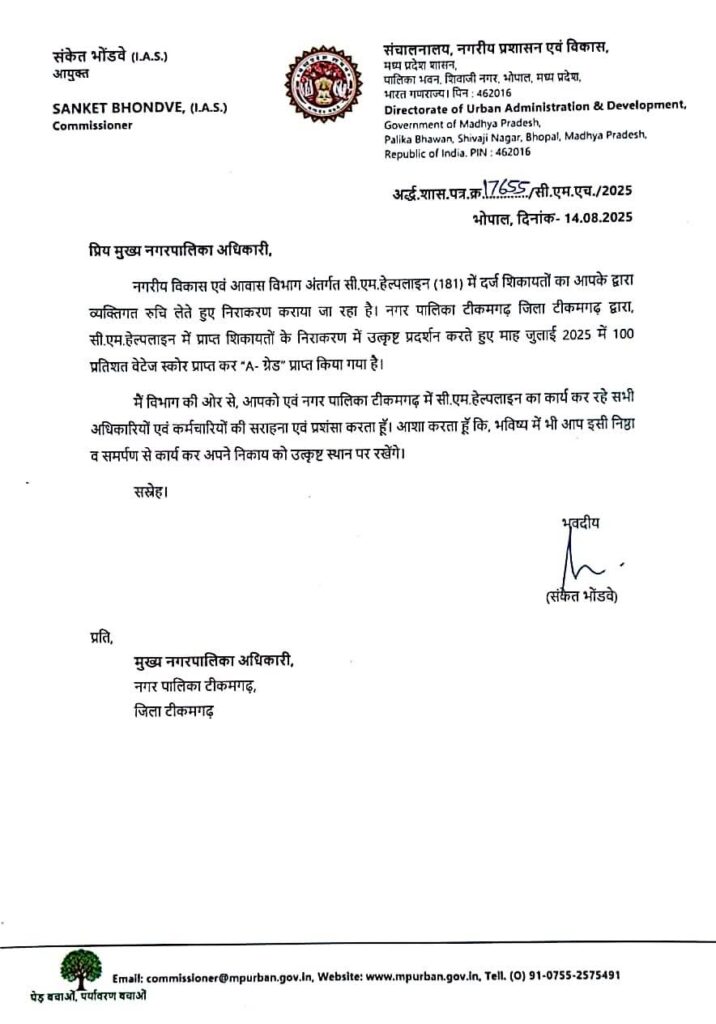 टीकमगढ़ नगर पालिका सीएमओ ओमपाल सिंह भदौरिया को नगरीय प्रशासन विभाग के कमिश्नर ने भेजा प्रशंसा पत्र
