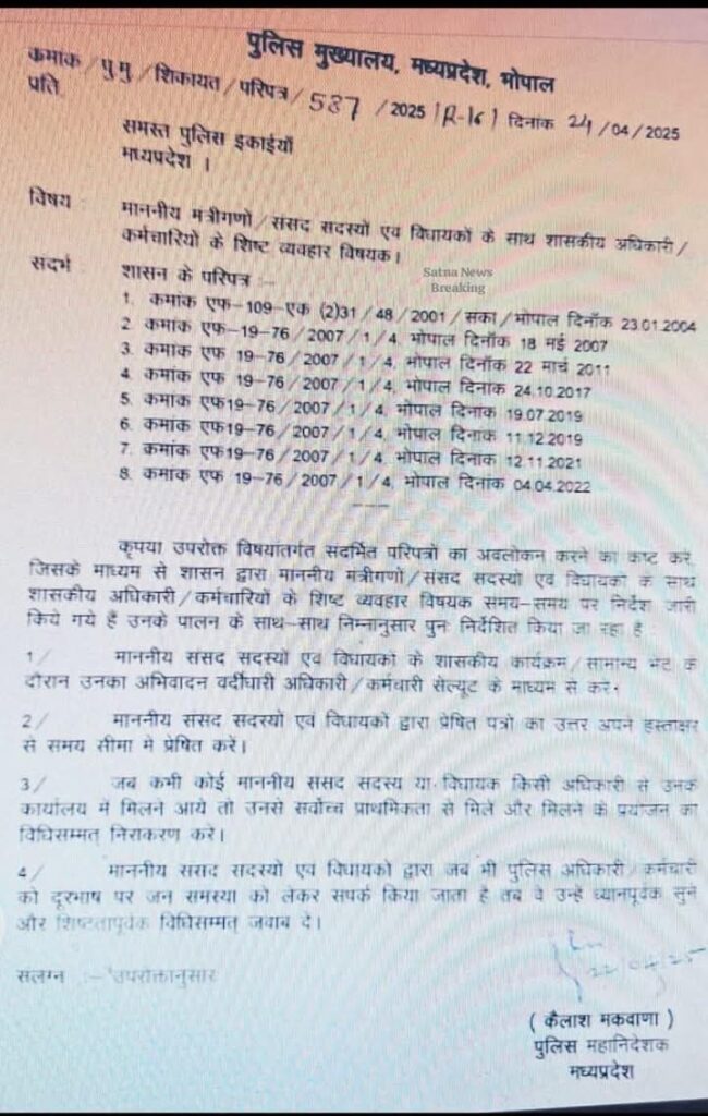 भोपाल। मध्यप्रदेश के पुलिस विभाग के मुखिया ने एक आदेश जारी किया हैं जिसमें अब प्रदेश के पुलिस अफसरों के सांसद-विधायकों को भी सैल्यूट करना होगा। डीजीपी कैलाश मकराना ने आदेश में यह भी कहा हैं की सांसदों -विधायकों की बातों को प्राथमिकता से सुनना होगा साथ हीं उनका निराकरण की जल्द से जल्द करना होगा। इतना हीं नहीं अब कोई भी अधिकारी सांसद विधायकों को इंतजार भी नहीं करा सकता हैं प्राथमिकता के साथ सबसे पहले अधिकारी को उनसे मिलना होगा।